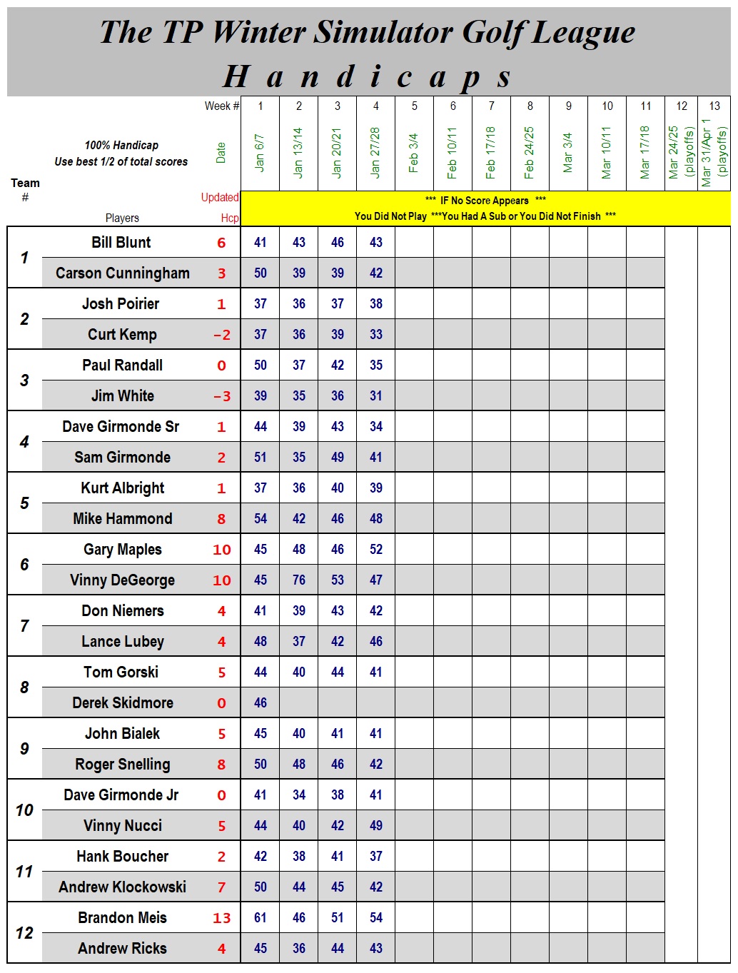 Home - Schedule - Standings & Weekly Games - Handicaps - Rules